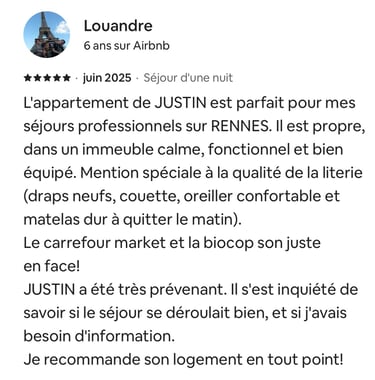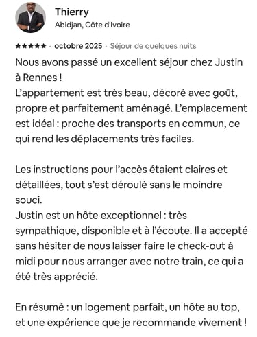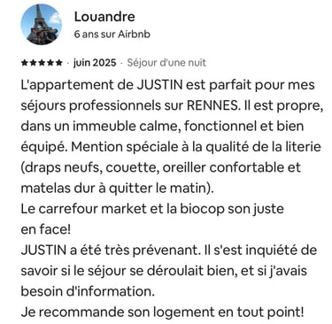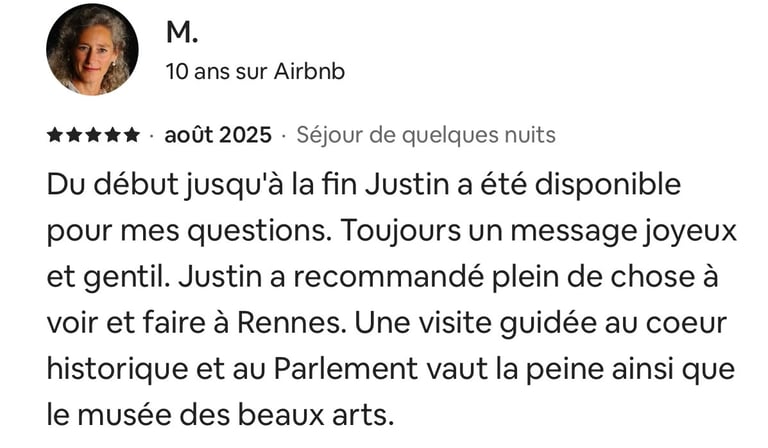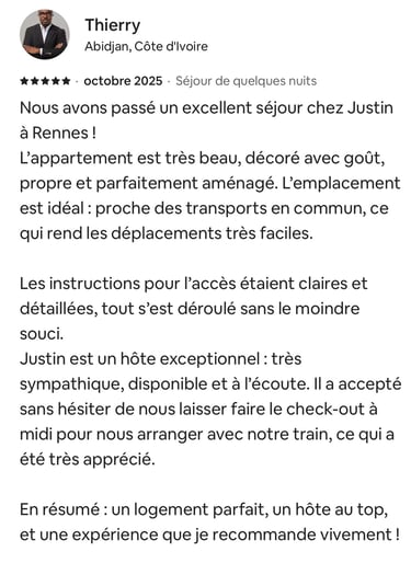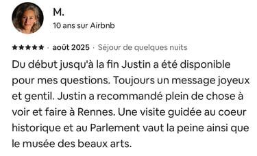 La satisfaction de nos voyageurs est notre priorité. Leurs avis témoignent de la qualité de notre gestion, de notre réactivité et de notre engagement au quotidien. Cette confiance est la meilleure garantie du sérieux et du professionnalisme de Breizh Hosting Conciergerie.